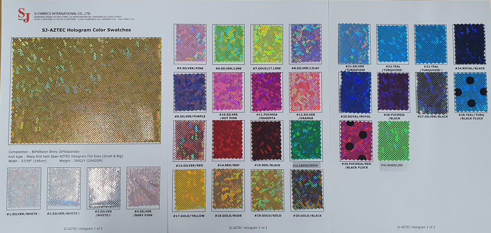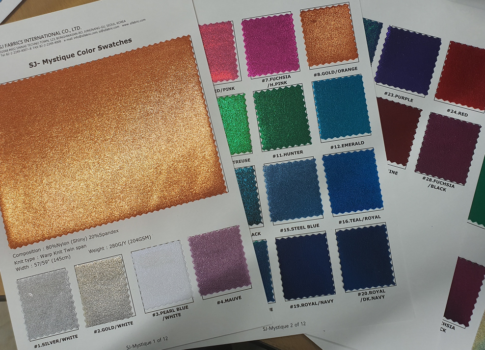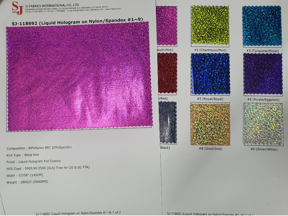 SJ FABRICS is an experienced fabric manufacturer and exporter that specializes in 'Fancy' Stretch and Novelty fabrics for Dancewear, Costuming, Party dresses, Swimwear, Skating, Gymnastics and a wide range of Woment's Clothing. SJ FABRICS INT'L is proud of our numerous years of manufacturing the highest quality fancy fabrics for the garment manufacturing industry. We are skilled in providing the freshst designs, finest quality and competitive priced fabrics and experts in exporting to the US, Canadian and EC markets. Our company began successfully manufacturing, sourcing and developing 'Fancy', Stretch and Novelty fabrics 1997.