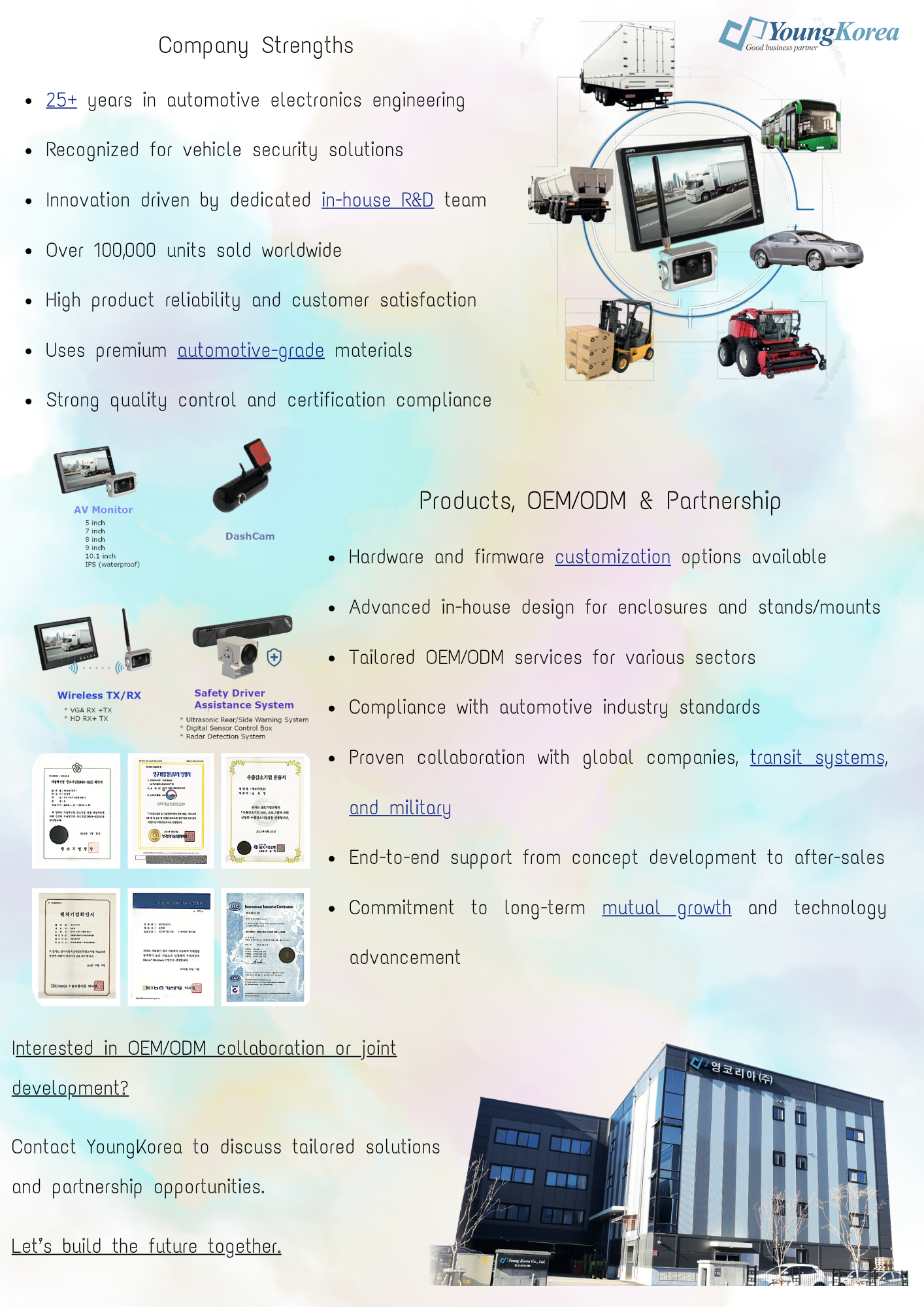 YoungKorea specializes in durable, customizable monitors and cameras for the aftermarket sector, serving all types of vehicles including trucks, buses, agricultural machinery, and military vehicles. With over 25 years of expertise, we’re recognized for both advanced technology, exceptional product durability, and after service.